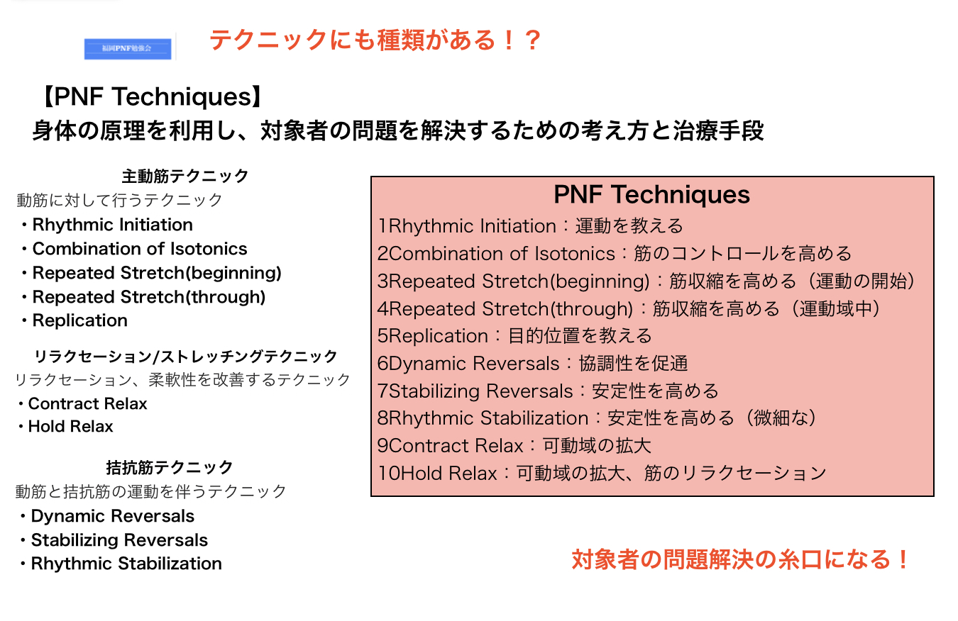 PNFには10個テクニックがあり、テクニックを大きく分けると、